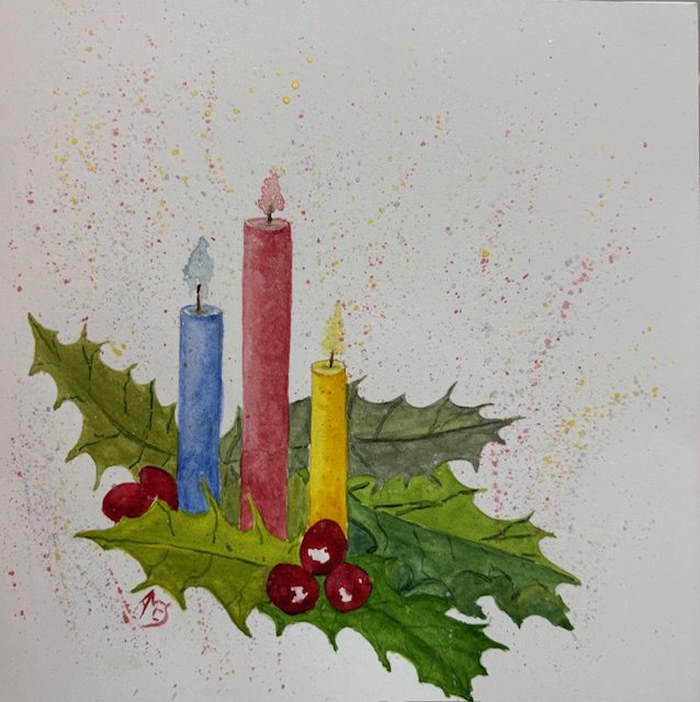 Retro vintage style hand-painted card with candles, holly and glitter splatter effects 6×6” with envelope in cellophane.