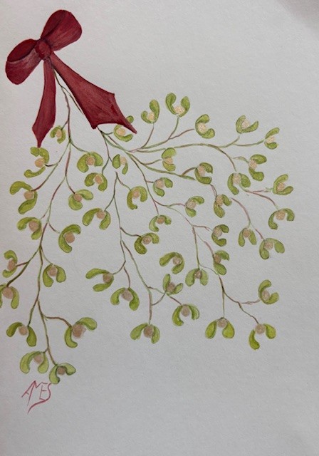Hand-painted 7×5” card. Mistletoe with Red Ribbon and glitter detailing