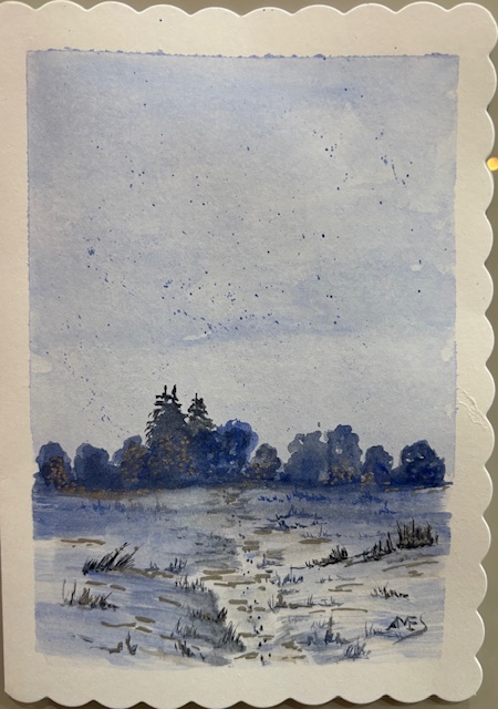 Hand-painted 7×5” card with winter landscape and glitter detail.